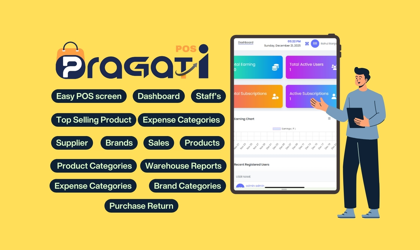 Pragati POS is a modern Point-of-Sale system built to simplify retail billing and business management. It delivers a seamless and intuitive interface for cashiers while providing powerful backend tools for business owners to track sales, stock, expenses, and customer history.